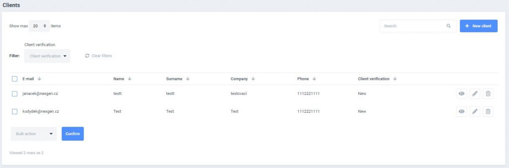 The submodule also allows adding new clients with a NEW CLIENT button or performing BULK ACTIONS for example a bulk verification or a bulk removal (only admin functionality).