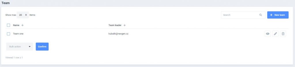 New team and bulk actions can also be performed within the Team Submodule with a NEW TEAM or BULK ACTION buttons (remove is only admin functionality).