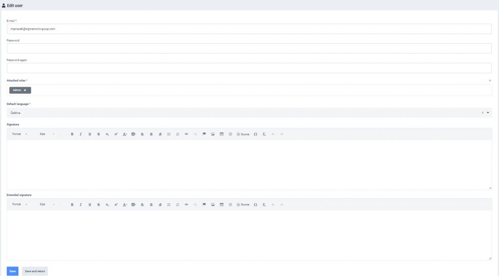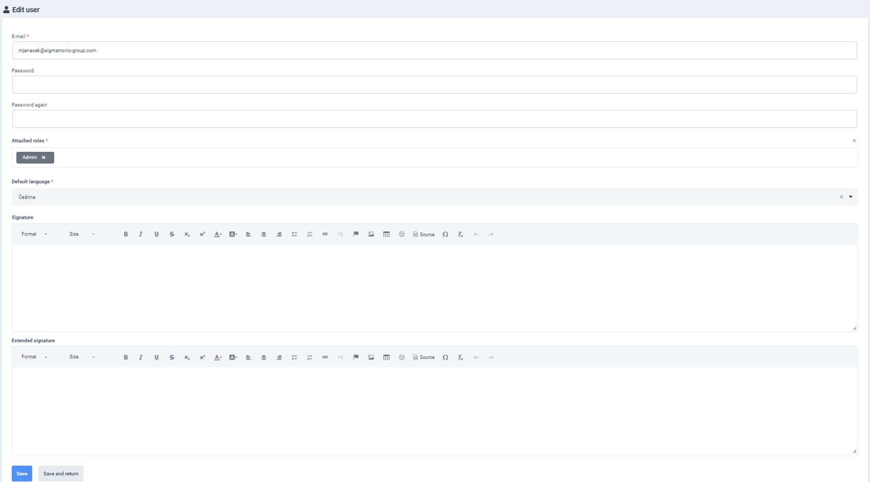 EDIT USER window is displayed after pressing NEW USER or EDIT USER. Parameters of selected users can be defined through this settings. An E-MAIL address can be allocated as well as PASSWORD AND REPEAT PASSWORD. A user ROLE and DEFAULT LANGUAGE can be attributed through a selector menu.