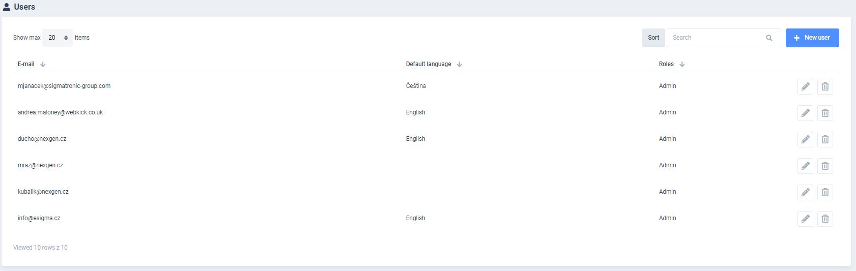 A table with the list of all system users is available upon opening the submodule. A full-text search, advanced filtering and a specified item-per-page display can be performed.